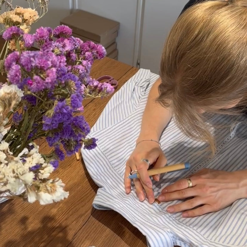 Plutôt que de les laisser dormir ou finir jetées, je les transforme. J’aime les retravailler, y ajouter une touche féminine, un détail romantique, et leur donner une seconde chance. Chaque pièce devient unique, avec une nouvelle histoire à porter et à faire vivre.